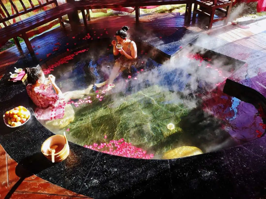 溫泉區域專(zhuān)為女士推出玫瑰香體湯、牛奶浴、紅酒浴,