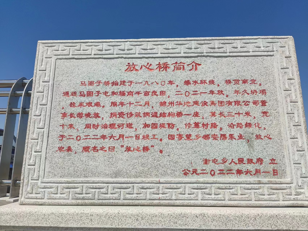 錦州華地建設集團董事長(cháng)薄曉放,得知了這一消息后,非常惦念家鄉父老,立即決定捐建一座橋,以解決家鄉人們出行難的問(wèn)題。因寄望鄉鄰安居樂(lè )業(yè),放心農桑,故取名放心橋。